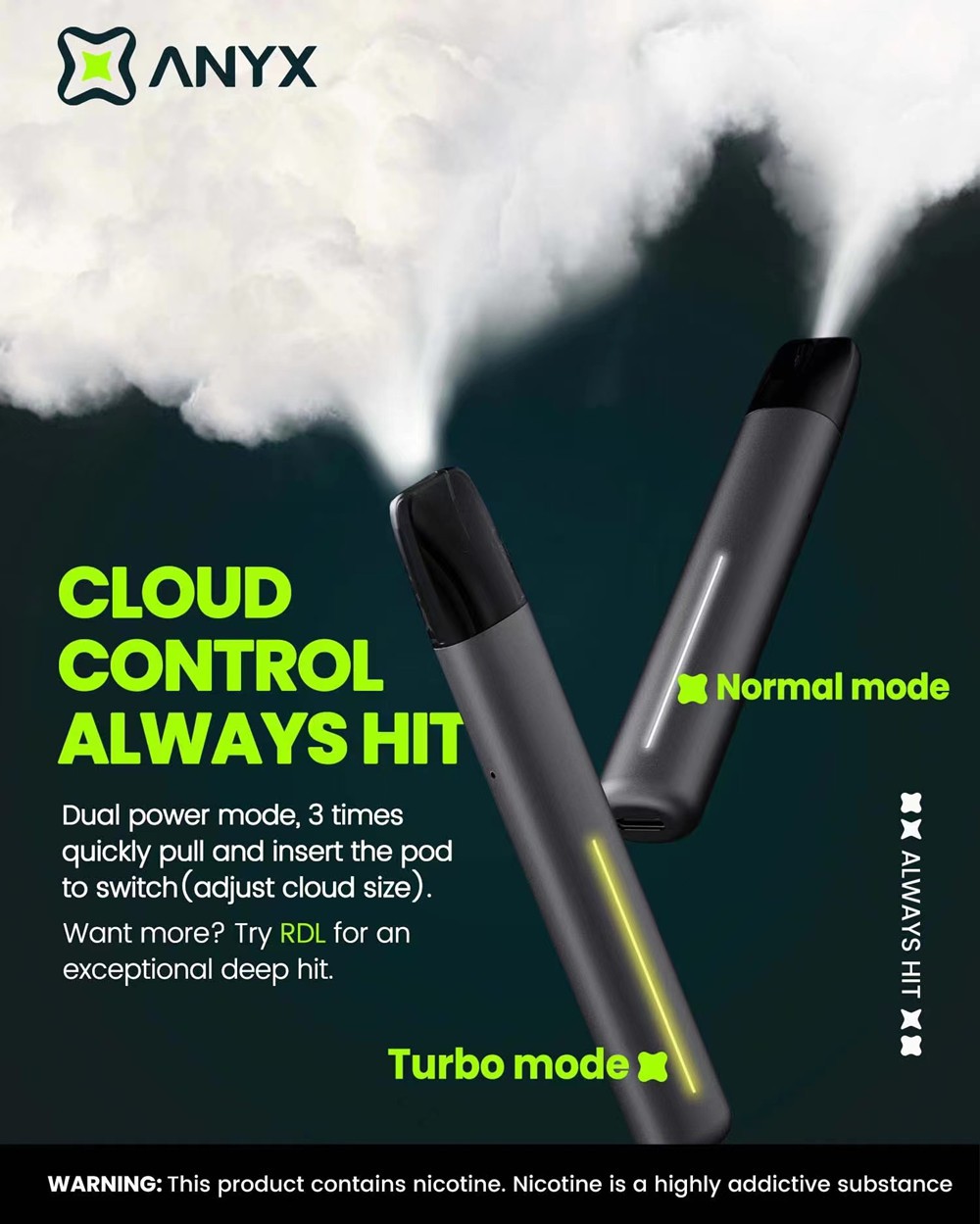 Dünyanın ilk gerçek çift modlu kapalı pod sistemi olan ANYX PRO, MCU akıllı sıcaklık kontrol çipi ile donatılmıştır ve Kısıtlı Doğrudan Akciğer (RDL) modunu destekleyerek seçilen moda bağlı olarak anında ancak önemli ölçüde farklı bir deneyim sunar: Normal modun hassas ve yumuşak deneyiminin yanı sıra Turbo modunun güçlü ve yoğun tadı. ANYX PRO, daha zengin bir tat deneyimi vaat ederek, bebek bezlerinin çeşitli tercihlerini karşılamak üzere tasarlanmıştır.
