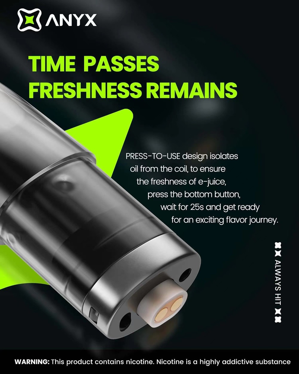 ANYX PRO, kullanıcı deneyimini bozabilecek atomizörlerin yaşlanmasıyla başa çıkmak için, e-likit depolama için kullanılan bobin ile atomize sıvı arasındaki uzun süreli temasın neden olduğu lezzet değişikliğini önleyen bir bobin-e-sıvı ayırma yapısını benimser. Ürün, kullanım sırasında yalnızca buharlaştırıcı tarafından sağlanan taze aromayı garanti etmekle kalmaz, aynı zamanda atomize sıvının sızmasını da etkili bir şekilde önler.
