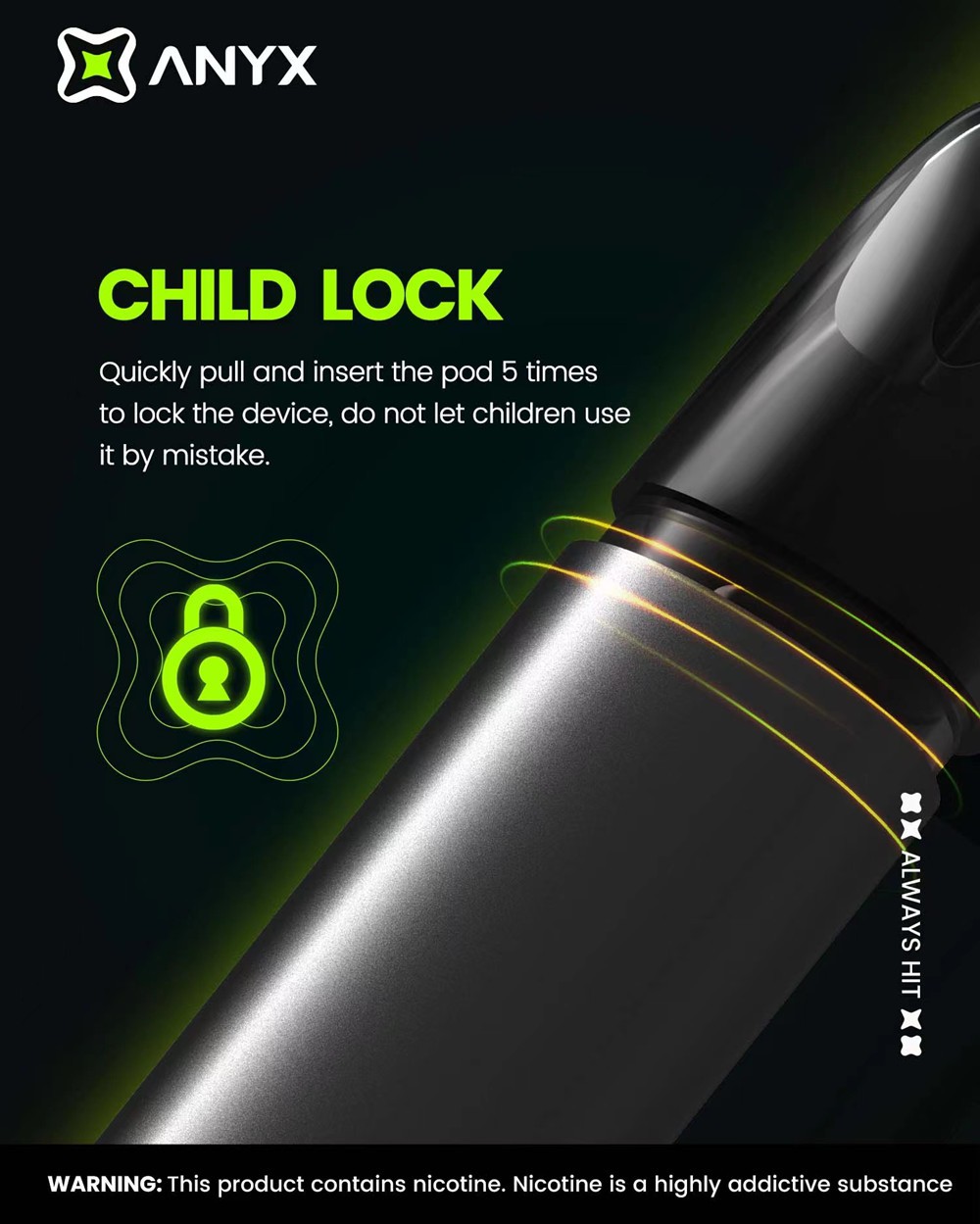 ANYX PRO, güvenliği ve güvenilirliği en üst düzeye çıkarmak için küçüklerin ürünü kullanmasını ve kullanmasını önlemek için çocuk kilidi özelliği ile birlikte gelir.